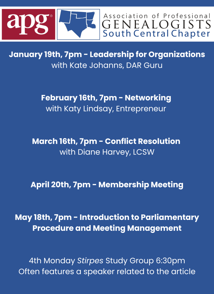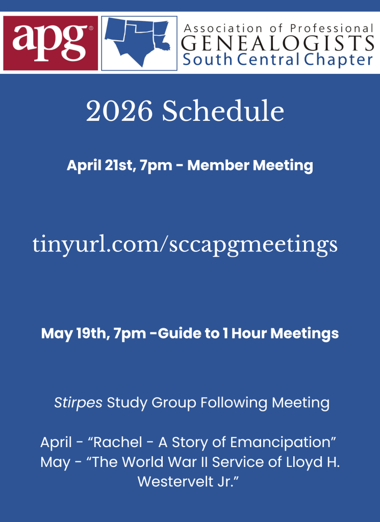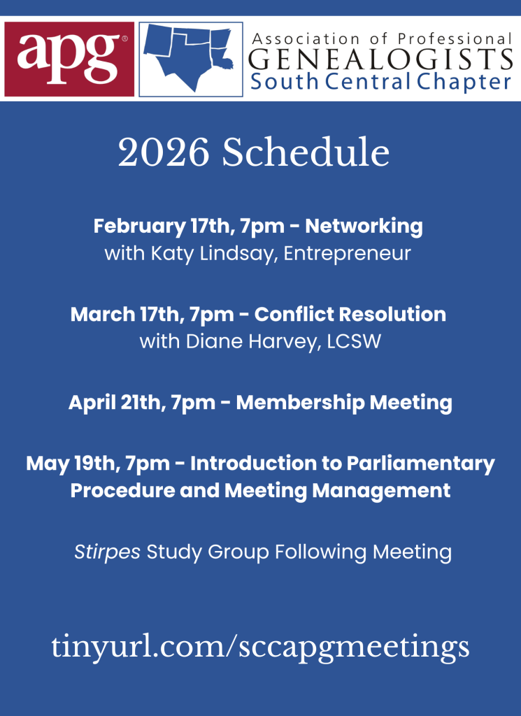 The South Central Chapter is a regional subgroup of APG. Our members represent the broad spectrum of genealogical pursuits covered by the APG umbrella.