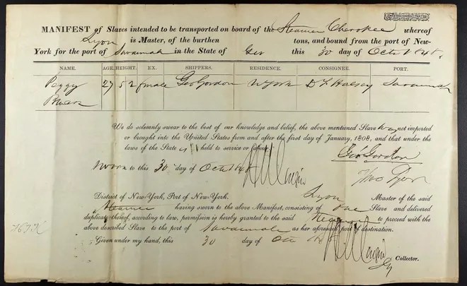 In later U.S. records (early 19th century), domestic slave trade manifests sometimes included first names and approximate ages, especially after laws required documentation of coastwise slave transport.